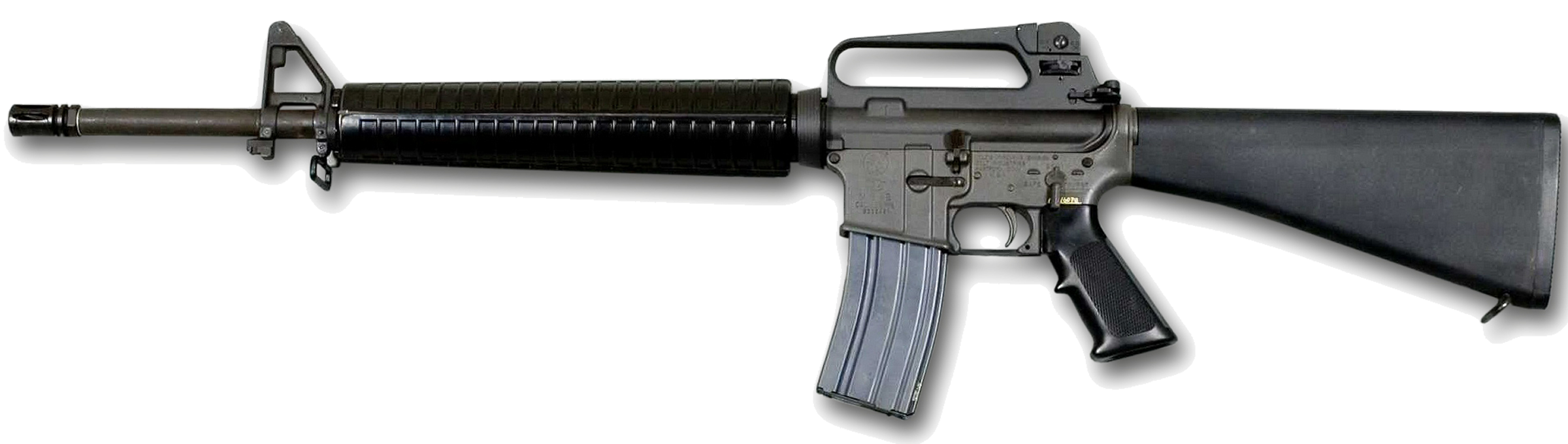 The M16A2 is a military adaptation of the AR-15 rifle. It features a 20-inch barrel, fixed stock, and is chambered in 5.56×45mm NATO.